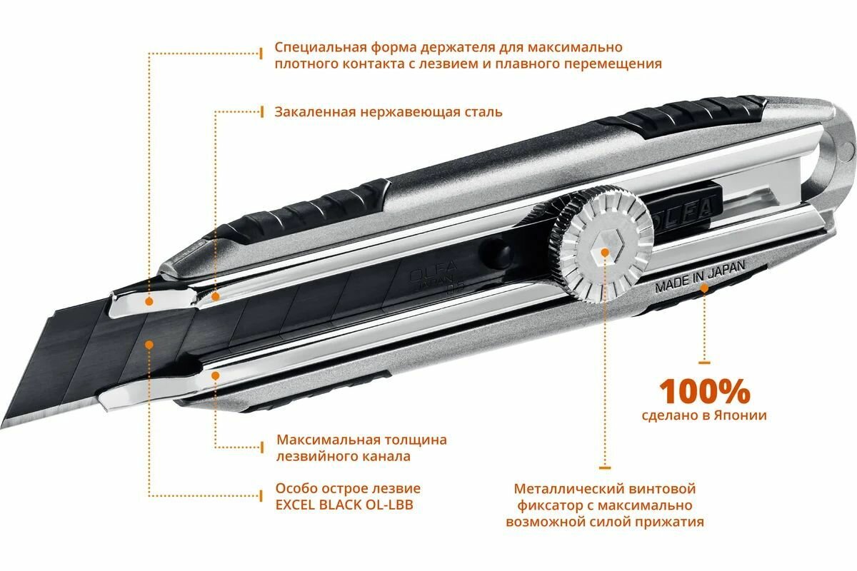 | Дополнительная информация | механизм "autolock" позволяет фиксировать положение лезвия автоматически; металлический выступ из стали толщиной 1.2 мм может использоваться для открывания банок с краской, заправки ковровых покрытий, вскрытия упаковки и т.д.; не подвержен воздействию органических растворителей; совместим с лезвиями шириной 18 мм (LFB, LB, LBB, LWB) |