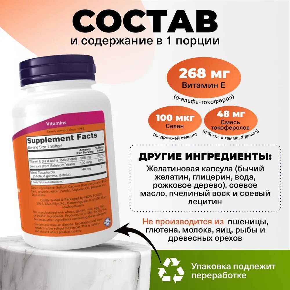 | Состав | Пищевая ценность Размер порции: 1 капсула Количество в 1 порции % от суточной нормы Витамин E (в виде d-альфа-токоферола) 268 мг 1787 Ингредиенты Капсула [бычий желатин (без ГЭКРС), глицерин, вода], органическое оливковое масло первого холодного отжима и смешанные токоферолы (d-бета, d-дельта, d-гамма). Содержит сою (витамин Е из сои без ГМО). При производстве не используются дрожжи, пшеница, глютен, молоко, яйца, рыба и морепродукты. Производится на предприятии, соответствующем стандартам надлежащей производственной практики, где выполняется обработка других ингредиентов, содержащих эти аллергены. |