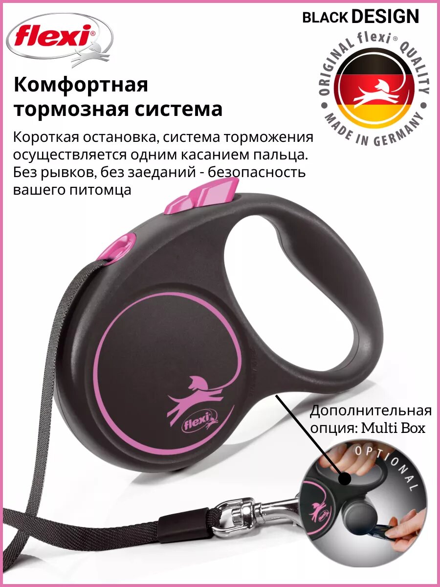 Flexi Рулетка Black Design S 5м до 15кг (ремень) черно-розовая