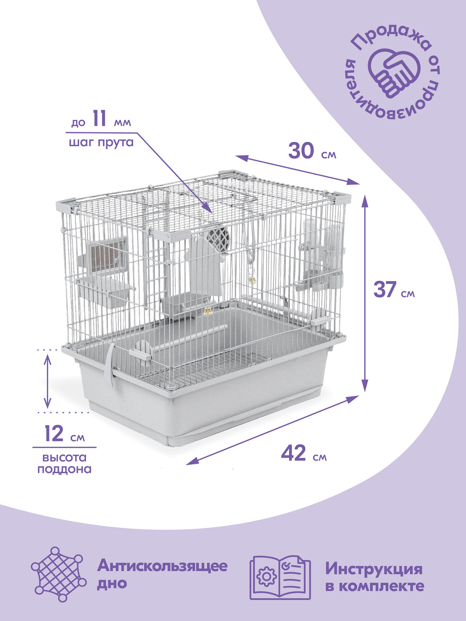 | В комплекте | жёрдочка / зеркальце / качели / кормушка / лесенка / поилка |