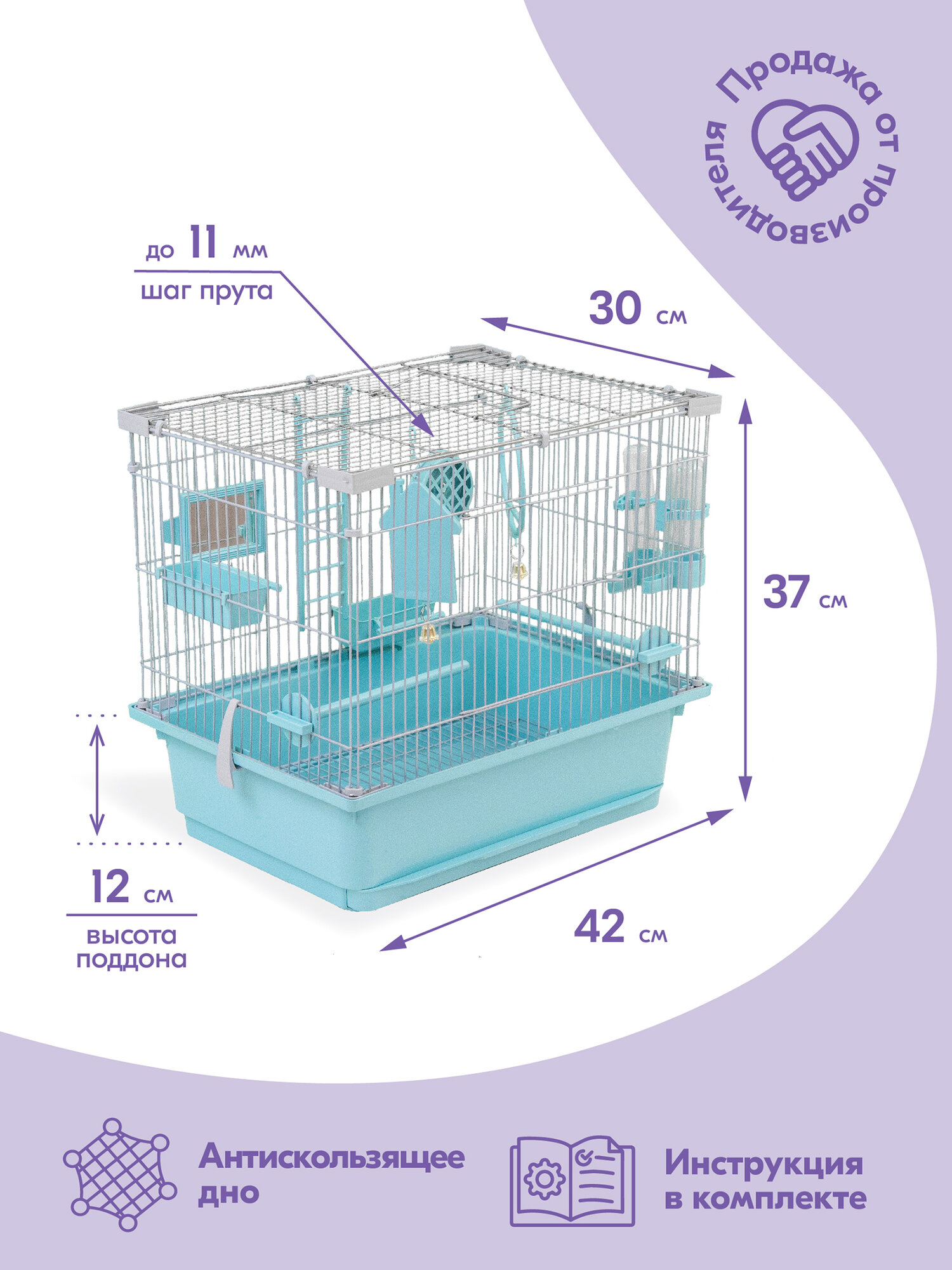 | В комплекте | жёрдочка / зеркальце / качели / кормушка / лесенка / поилка |