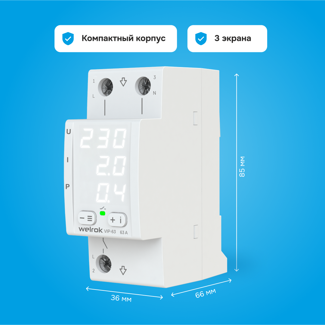 Welrok VIP-63 Многофункциональное реле с контролем напряжения, тока и мощности, 63А