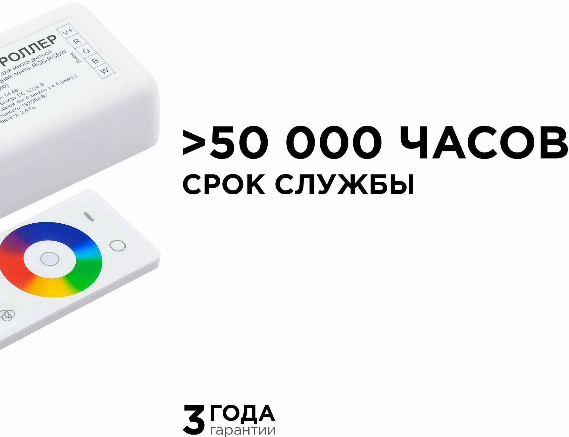 Контроллер 3-х зонный RGB - RGBW, 12/24В, 192/384Вт, 4*4А, IP20, пульт сенсорный, радио, 11 кноп. и кольцо.