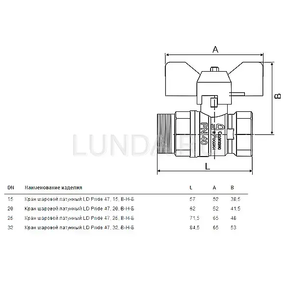 LD Pride Кран шаровой латунный 47.15.B-Н.Б, вн./нар.резьба, ручка-бабочка, 1/2" LD 47.302.15