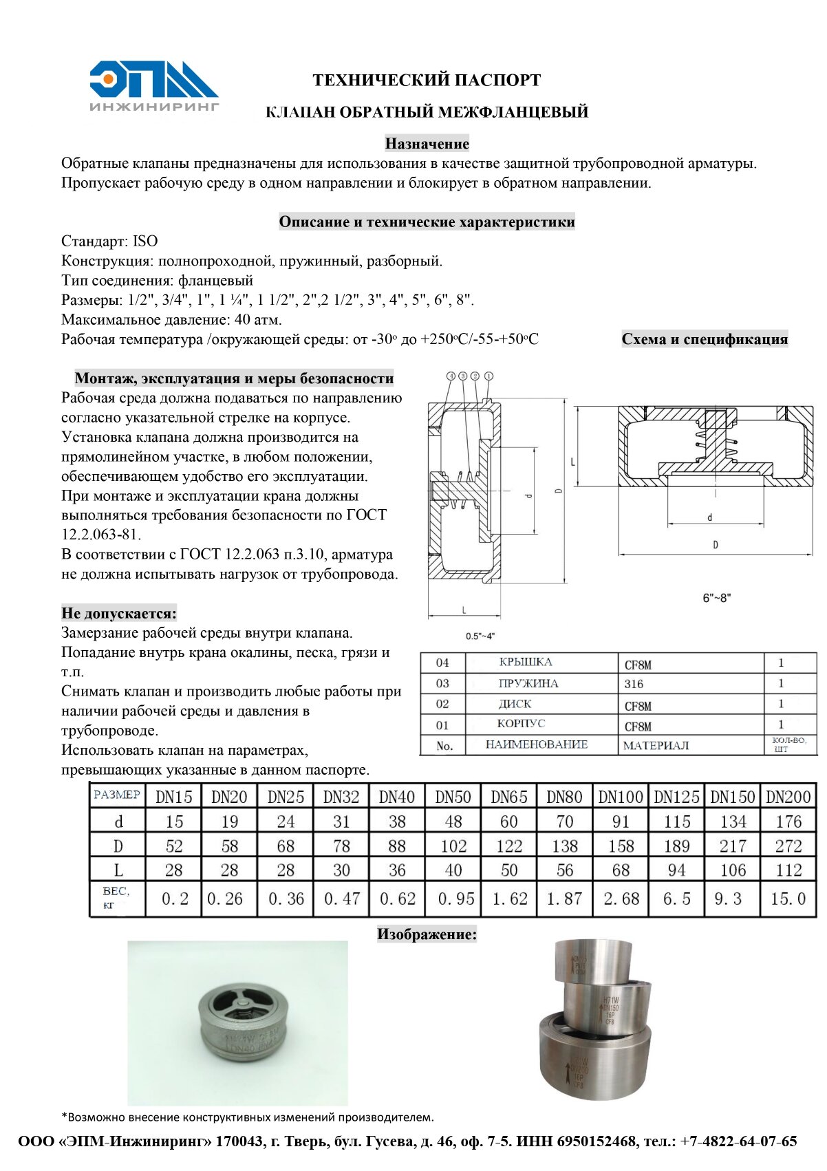 Обратный клапан нержавеющий межфланцевый DN 50 (2") AISI 316 тарельчатый интересное: