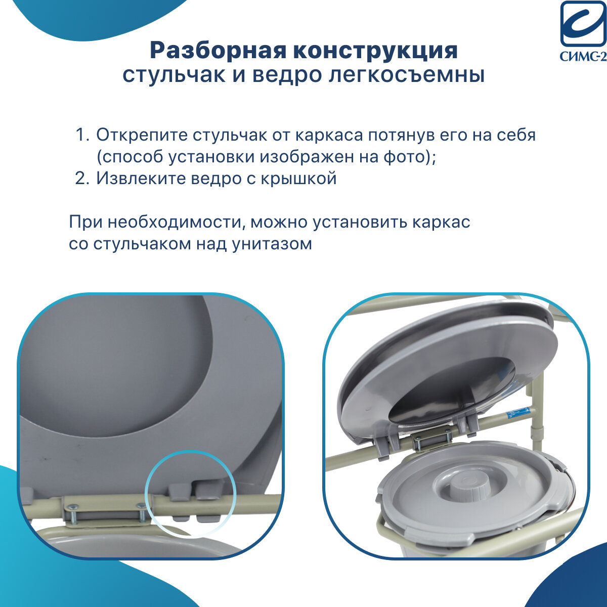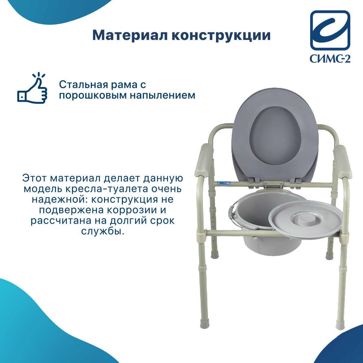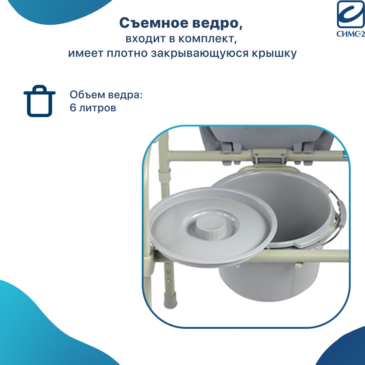 | Комплектация | рама туалета, поручни с подлокотниками, ножки выдвижные, сиденье с крышкой, ведро с крышкой, спинка, комплект крепежных изделий, руководство по эксплуатации |