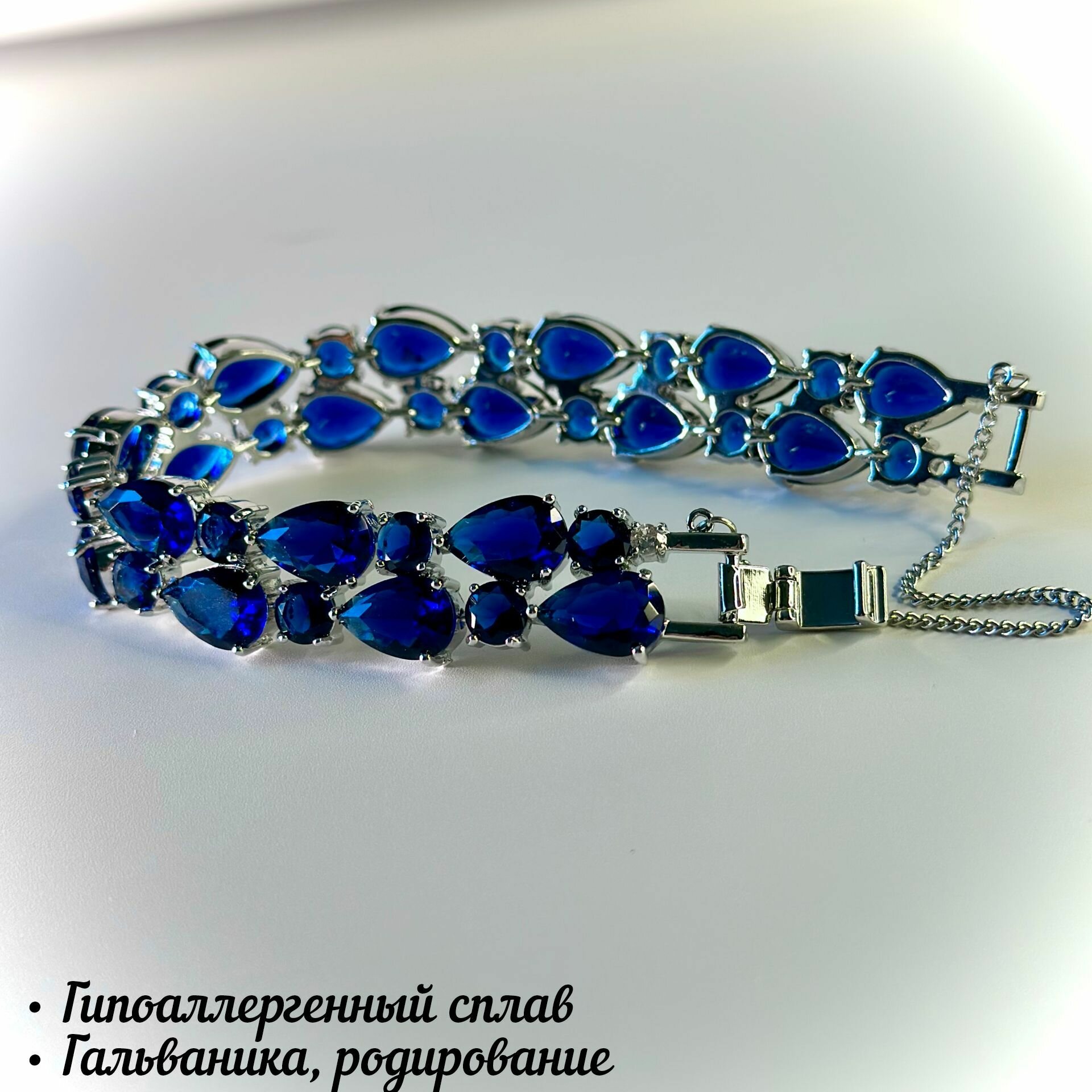 Позолоченный женский браслет с австрийскими кристаллами. Браслет 19 см с синими камнями.