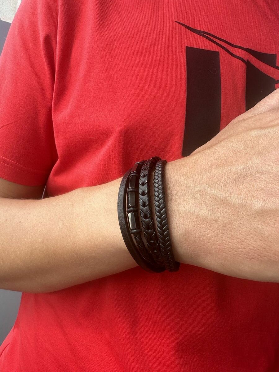 Браслет мужской многослойный из кожи микрофибра и стали 316L с удлинителем/чёрный(19+1.5 см)