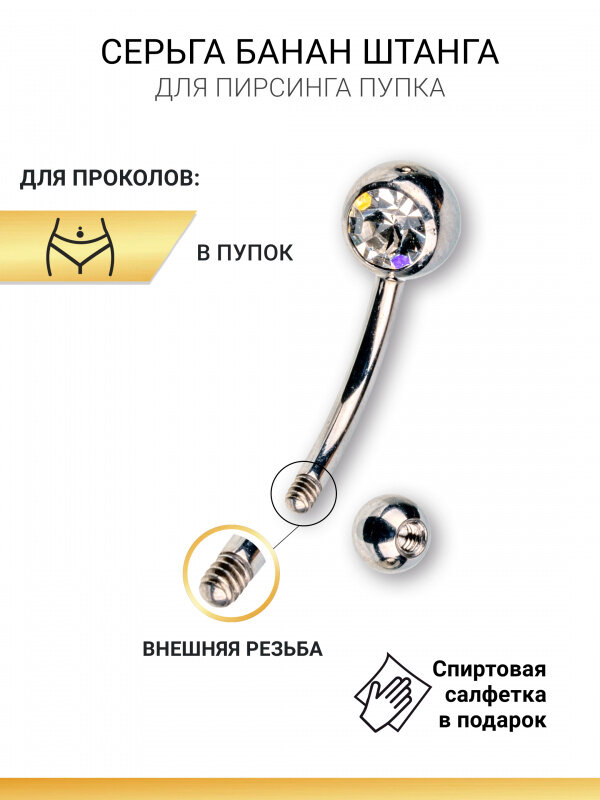 Кольцo в пупок / пирсинг пупка / сережка банан с цирконами / камнями / цвет золото и серебро / серьга / сталь