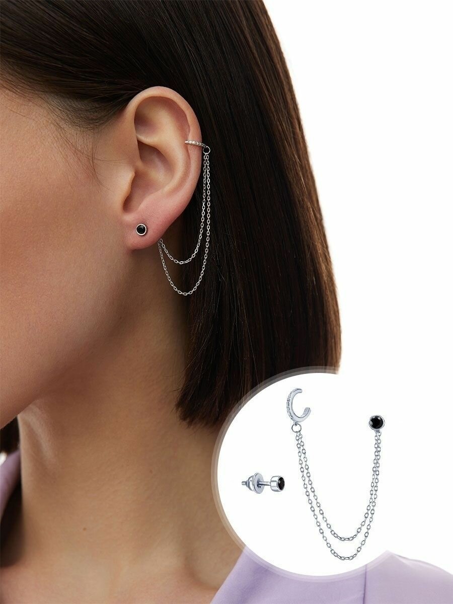 Моносерьга MIESTILO серебро 925, одиночная серьга кафф с цепочкой