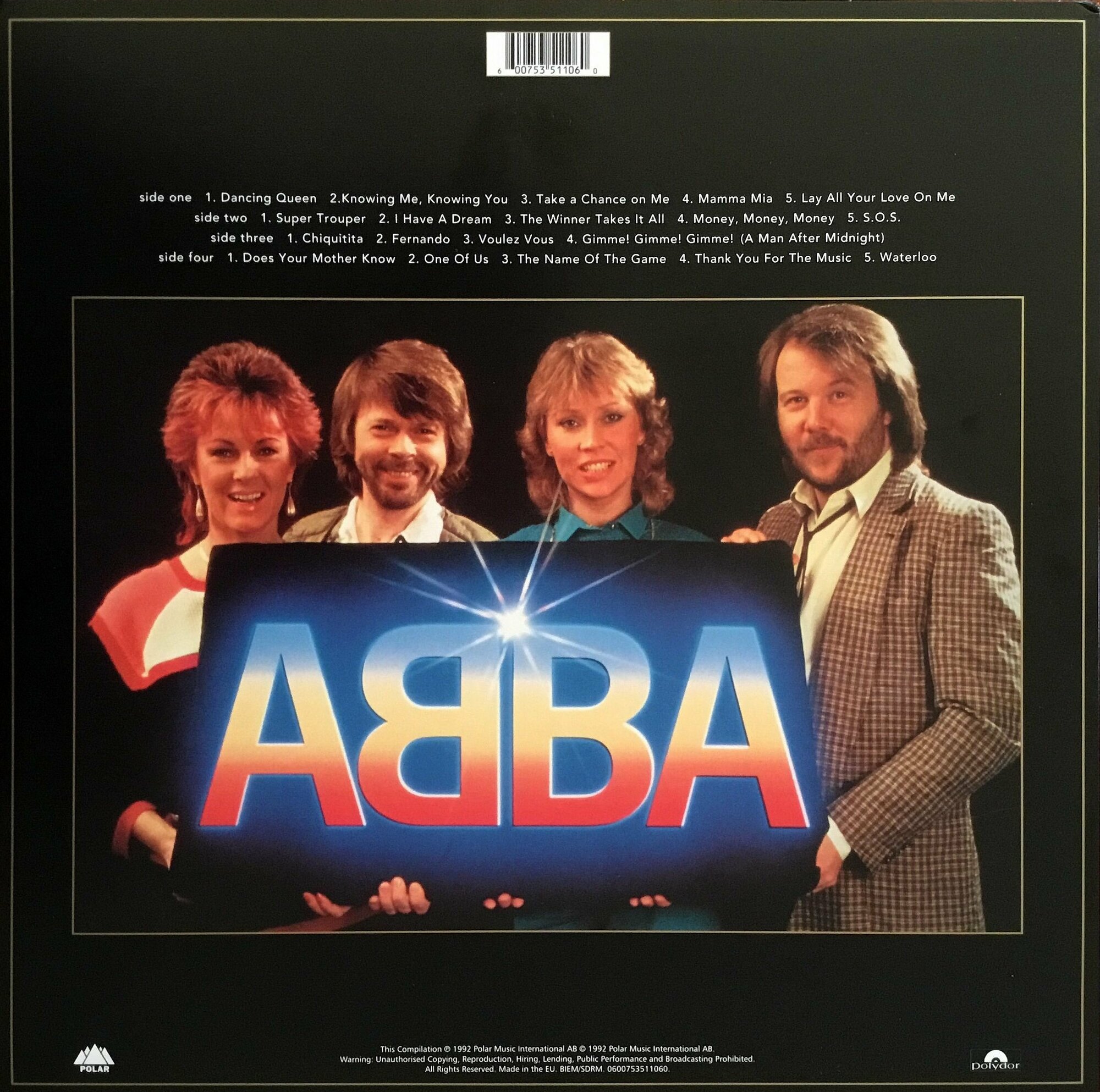 | Треклист | A1. Dancing Queen 3:49 A2. Knowing Me, Knowing You 4:01 A3. Take A Chance On Me 4:01 A4. Mamma Mia 3:32 A5. Lay All Your Love On Me 4:32 B1. Super Trouper 4:10 B2. I Have A Dream 4:43 B3. The Winner Takes It All 4:54 B4. Money, Money, Money 3:05 B5. S.O.S. 3:19 C1. Chiquitita 5:26 C2. Fernando 4:10 C3. Voulez-Vous 5:05 C4. Gimme! Gimme! Gimme! (A Man After Midnight) 4:46 D1. Does Your Mother Know 3:14 D2. One Of Us 3:53 D3. The Name Of The Game 4:50 D4. Thank You For The Music 3:51 D5. Waterloo 2:42 |