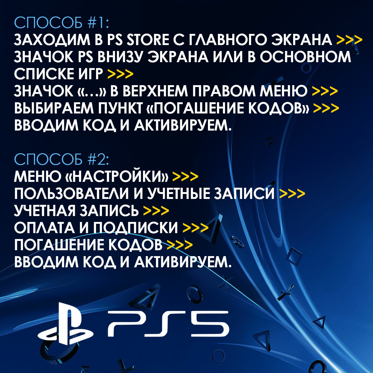 | Инструкция по активации | Как активировать подарочную карту для PS Store USA? Просто следуйте этим шагам: 1. Откройте PlayStation Store и перейдите к своему профилю, щелкнув на своем аватаре в верхней части экрана. 2. В меню, которое появится, выберите "Погашение кодов". 3. Введите код с вашей подарочной карты и нажмите "Погасить". 4. После этого средства или материалы сразу же будут зачислены на вашу учетную запись. |