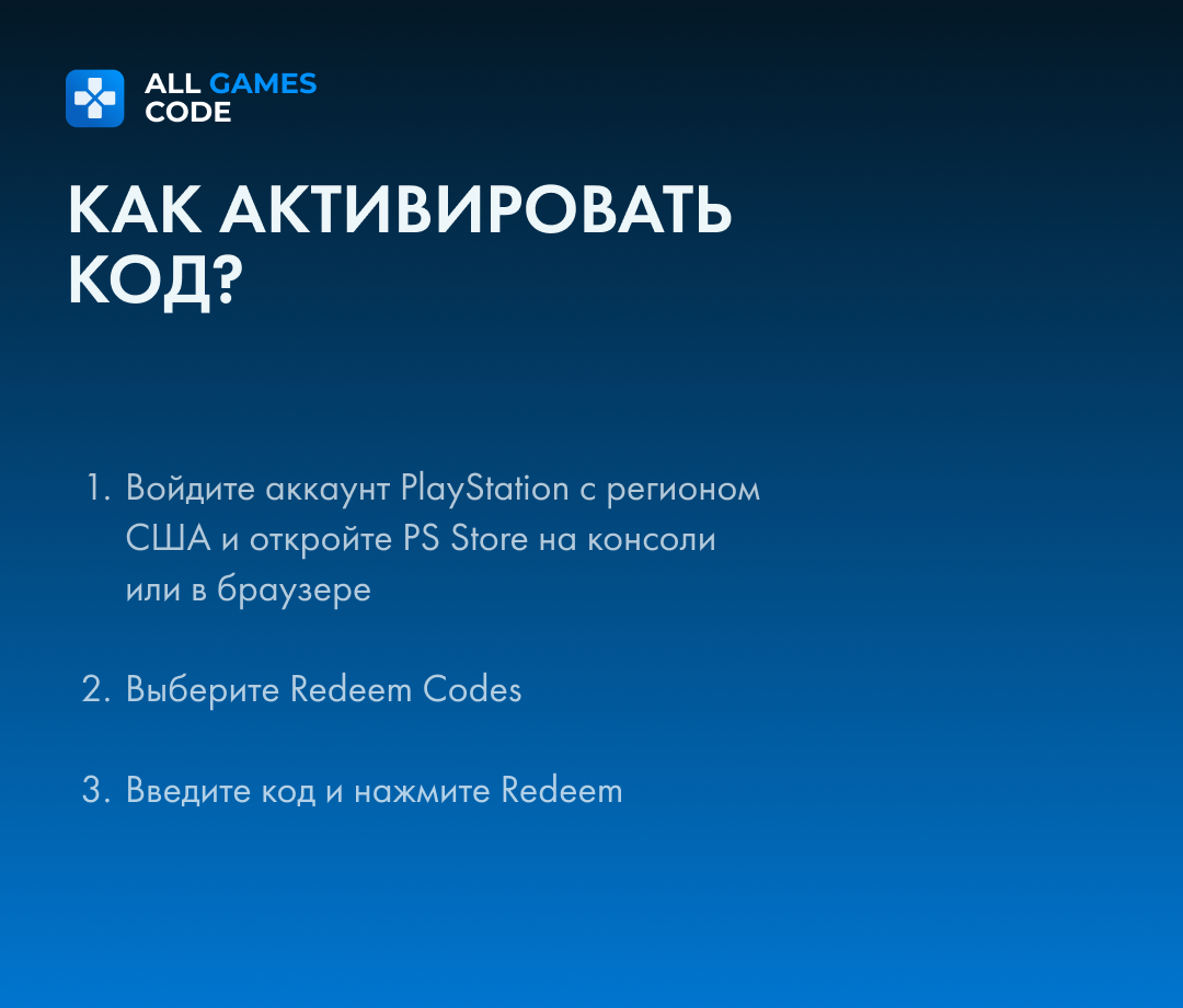 | Инструкция по активации | Как активировать подарочную карту для PS Store USA? Просто следуйте этим шагам: 1. Откройте PlayStation Store и перейдите к своему профилю, щелкнув на своем аватаре в верхней части экрана. 2. В меню, которое появится, выберите "Погашение кодов". 3. Введите код с вашей подарочной карты и нажмите "Погасить". 4. После этого средства или материалы сразу же будут зачислены на вашу учетную запись. |