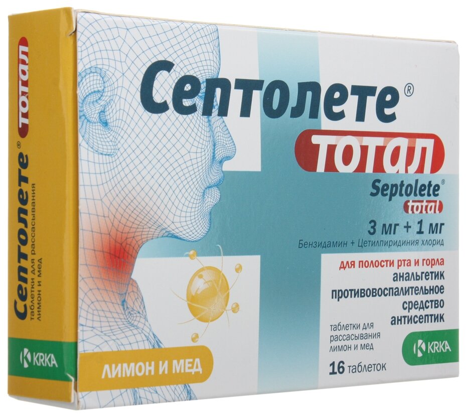 | Способ применения и дозы | Таблетки следует медленно рассасывать во рту каждые 3-6 часов.Взрослые, пациенты пожилого возраста и дети старше 12 лет Рекомендованная доза составляет 3-4 таблетки в сутки.Дети от 6 до 12 лет Рекомендованная доза составляет 3 таблетки в сутки.Не следует превышать указанную дозу.Препарат Септолете тотал не следует применять одновременно с другими препаратами из группы антисептиков. Препарат Септолете тотал не следует применять более 7 дней. |