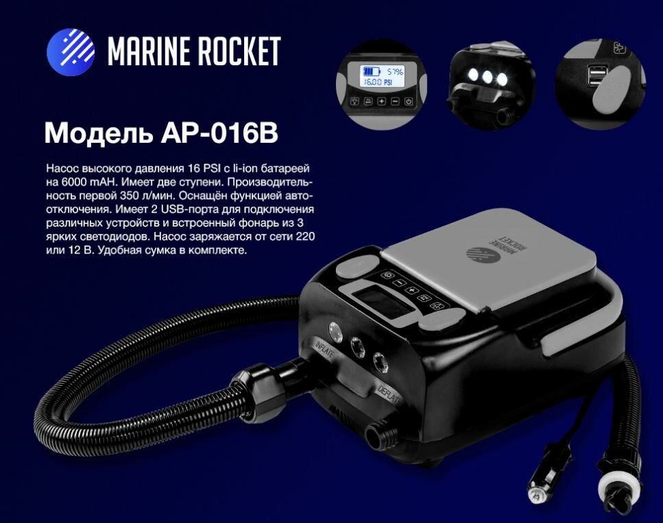 Насос аккумуляторный электрический 12 Вольт Marine Rocket AP-016B 12v для накачки лодки ПВХ