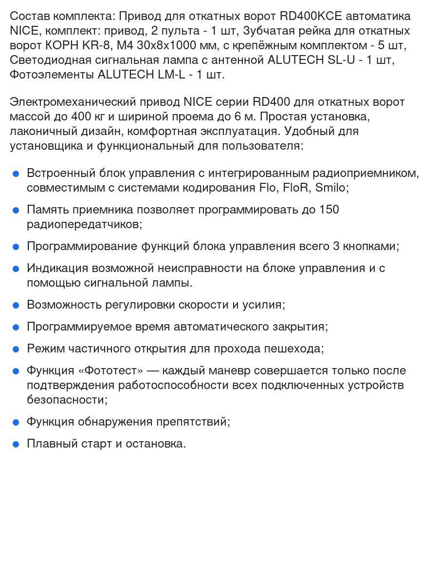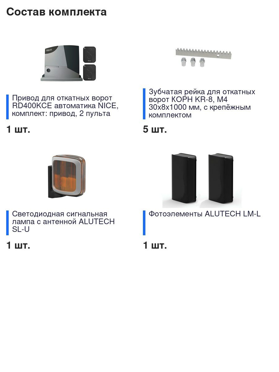 | Подробная комплектация | Привод для откатных ворот RD400KCE автоматика NICE, комплект: привод, 2 пульта - 1 шт, Зубчатая рейка для откатных ворот KR-8, M4 30х8х1000 мм, с крепёжным комплектом - 5 шт, Светодиодная сигнальная лампа с антенной SL-U - 1 шт, Фотоэлементы LM-L - 1 шт. |