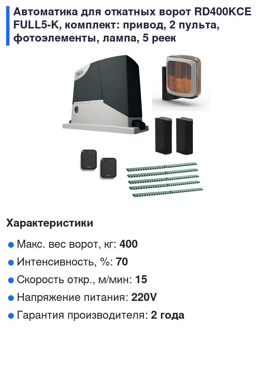 Автоматика для откатных ворот RD400KCE FULL5-K, комплект: привод, 2 пульта, фотоэлементы, лампа, 5 реек интересное: