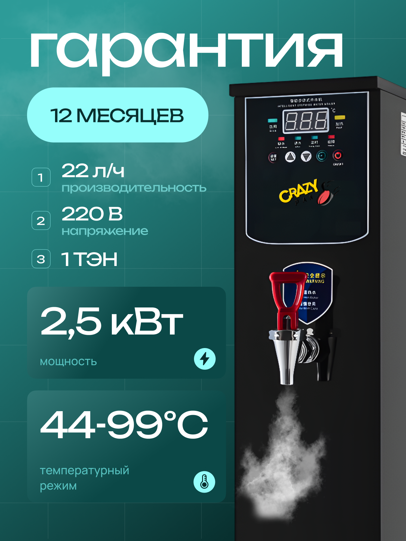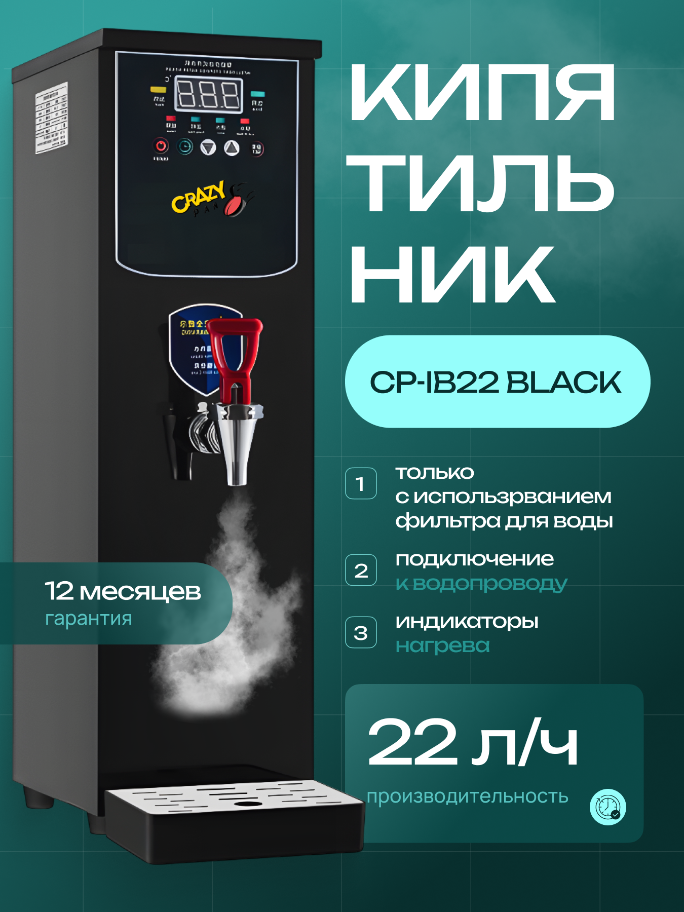 Электрокипятильник проточный Crazy Pan CP-IB22, 2,5 кВт, 22л/ч, таймер, объем бойлера 8 литров