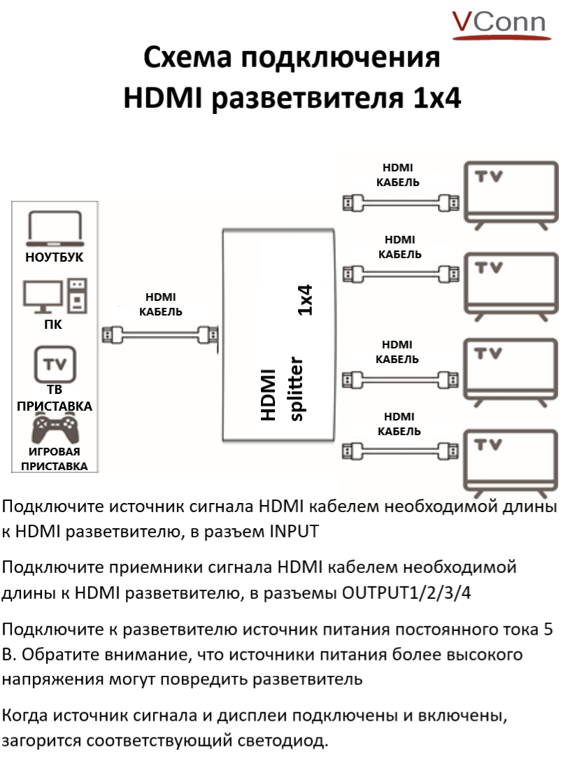 Сплиттер HDMI 1х4 Ultra HD, 4Кх2К, 30Гц, 3D версия 1.4 /VСonn/ интересное: