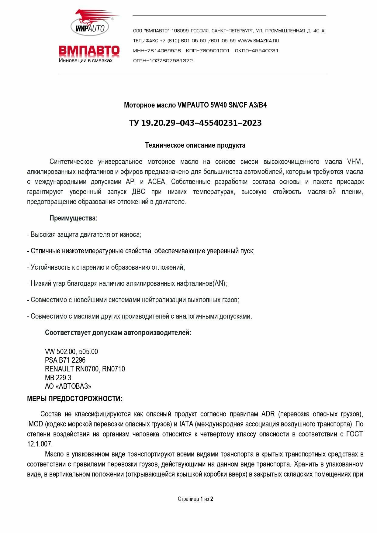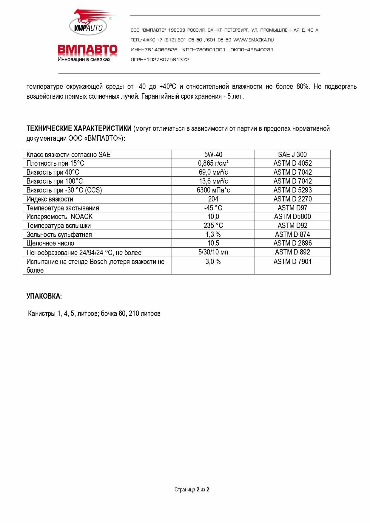 | Дополнительная информация | соответствует допускам автопроизводителей: VW 502.00, 505.00 PSA B71 2296 RENAULT RN0700, RN0710 MB 229.3 АО «АВТОВАЗ» ТЕХНИЧЕСКИЕ ХАРАКТЕРИСТИКИ на синтетическое моторное масло ВМПАВТО 5w40 3-SN (A3/B4, SN/CF). |