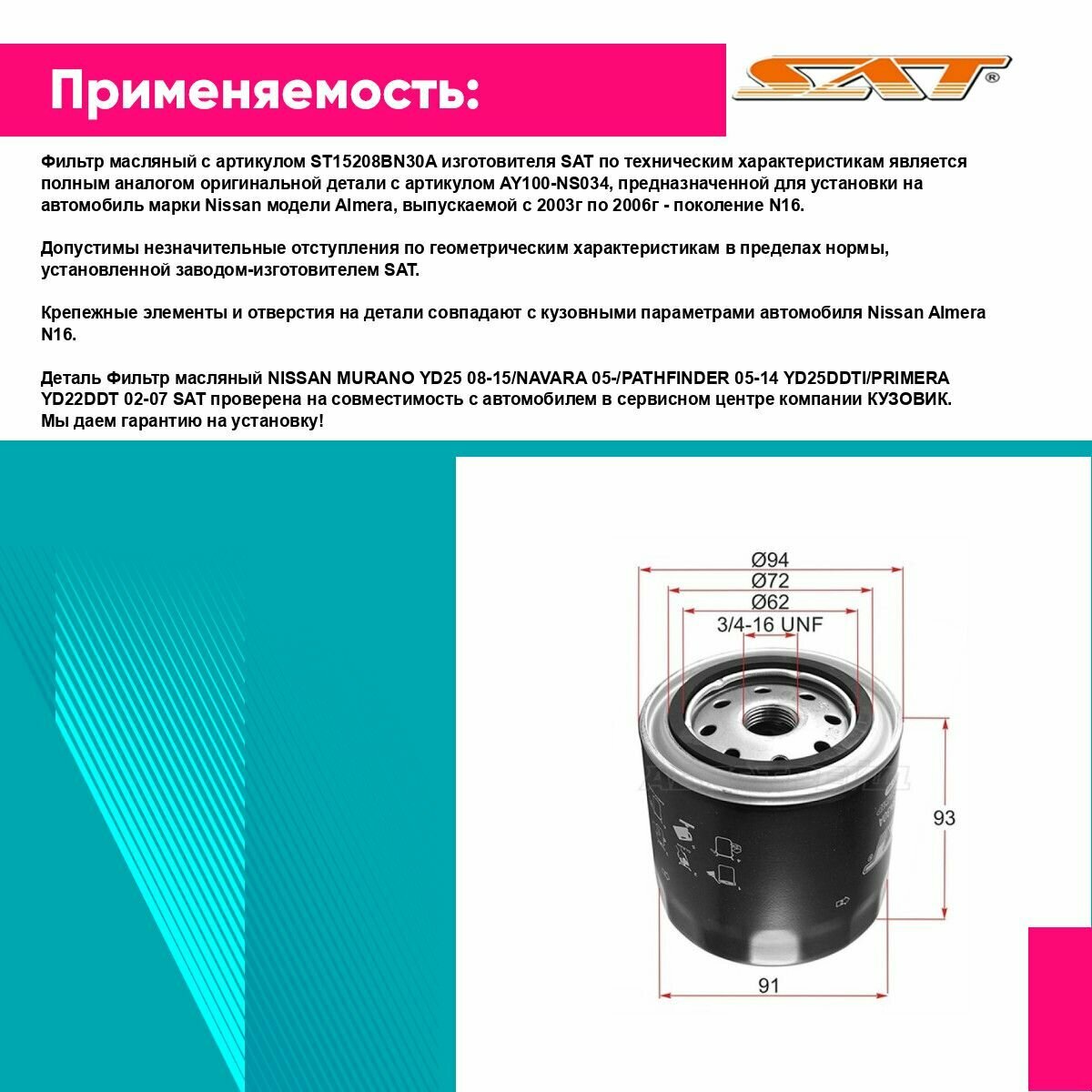 Купить Фильтр масляный NISSAN MURANO YD25 08-15/NAVARA 05-/PATHFINDER 05-14 YD25DDTI/PRIMERA YD22DDT 02-07 SAT ниссан альмера