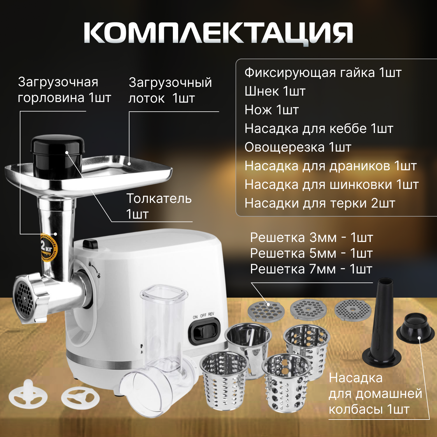 | Насадки | диск для фарша / насадка для кеббе / насадка для приготовления колбас / насадка для шинковки / насадка-терка |