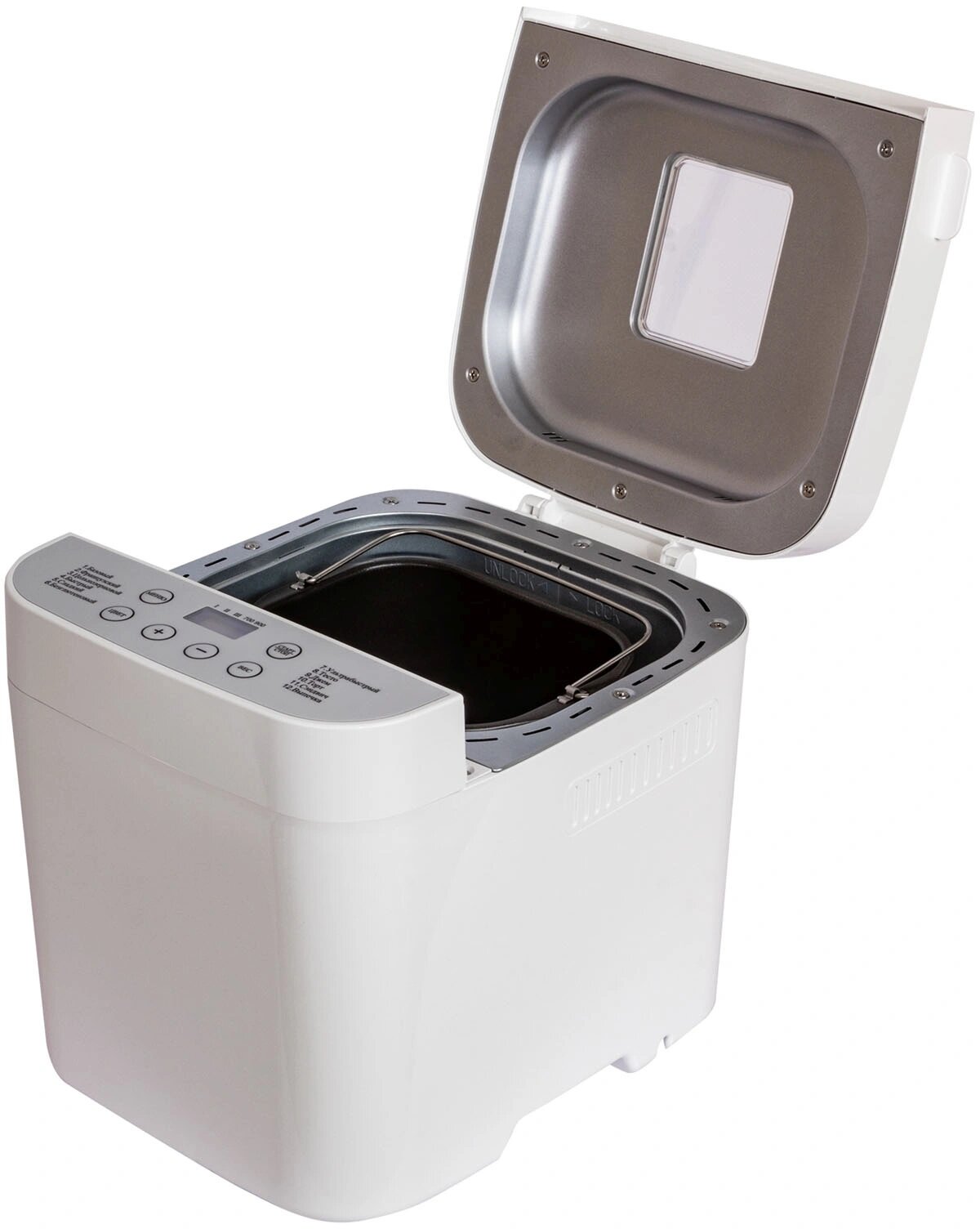 | Дополнительная информация | Отложенный старт; Поддержание температуры после выпекания; Индикация включениявремени приготовления; Прорезиненные ножки; Дисплей; Съемная форма; Звуковой сигнал; Окно контроля процесса; Сохранение программы при сбое электропитания; Отключение звукового сигнала; Программы хлебопечения: безглютеновый хлеб/безглютеновый кекс/ржаной хлеб/бородинский хлеб; Программы приготовления: тесто/варенье/кекс; Дополнительно в комплекте: мерный стакан, мерная ложка |