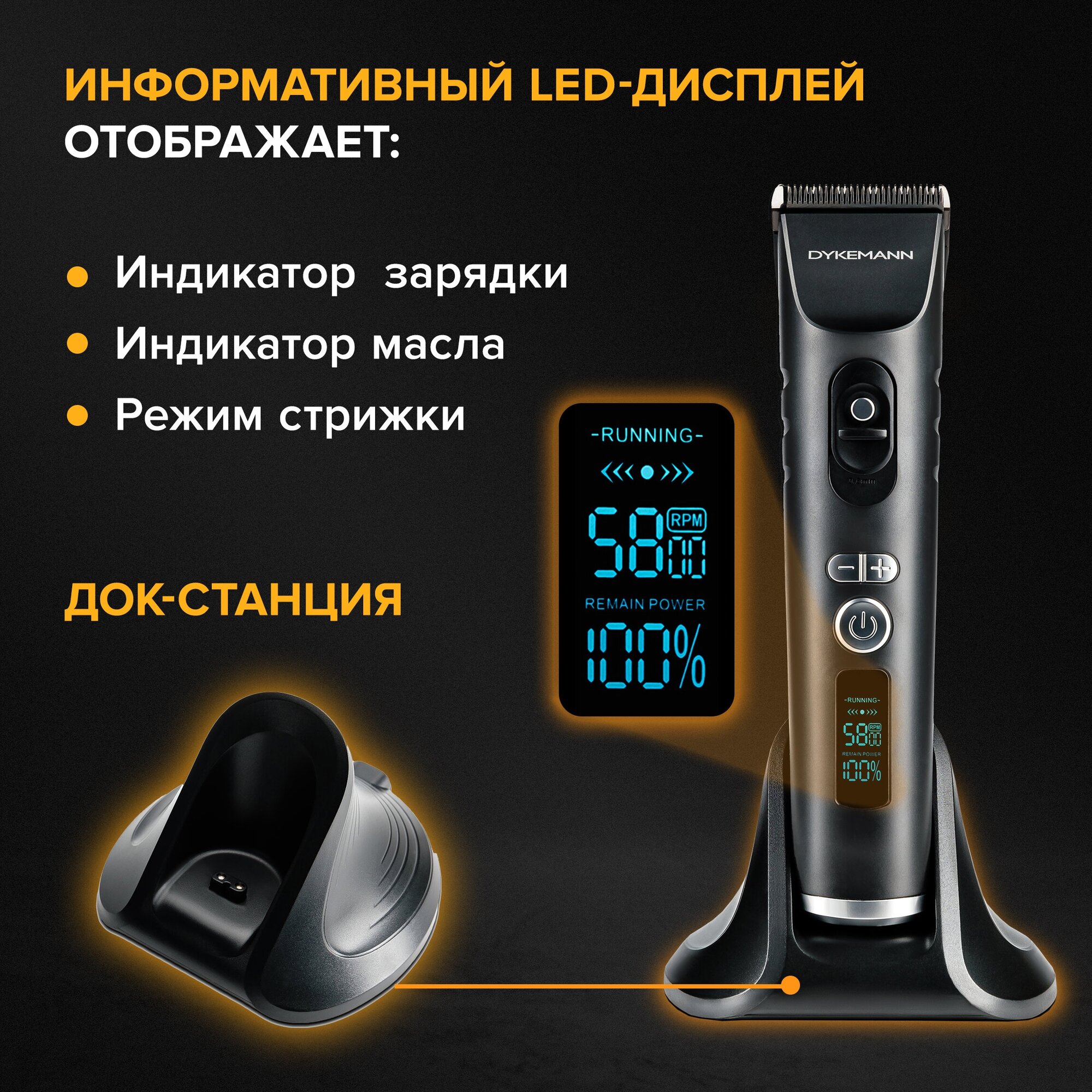 Купить Машинка для стрижки волос и бороды Dykemann Friseur H22/Триммер роторный для барбера, парикмахера/Доп. станция, дисплей/8насадок