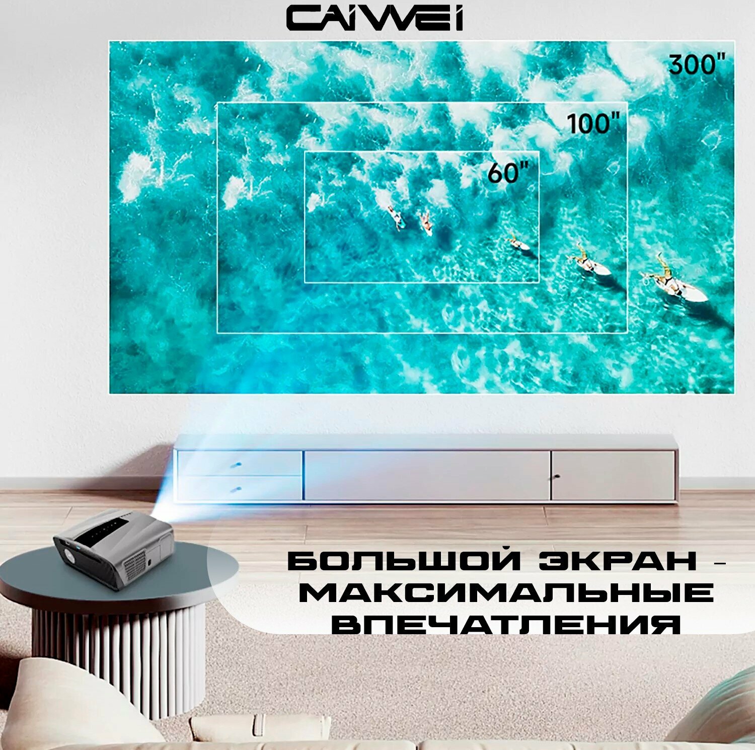 Проектор для фильмов CAIVVEI "LED-345MA", поддержка 4K, 3D, Bluetooth, Wi-Fi