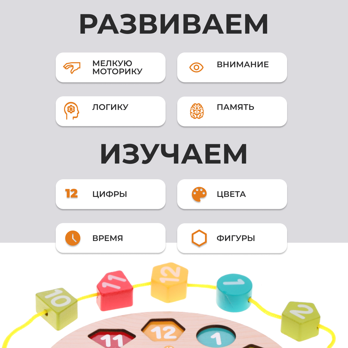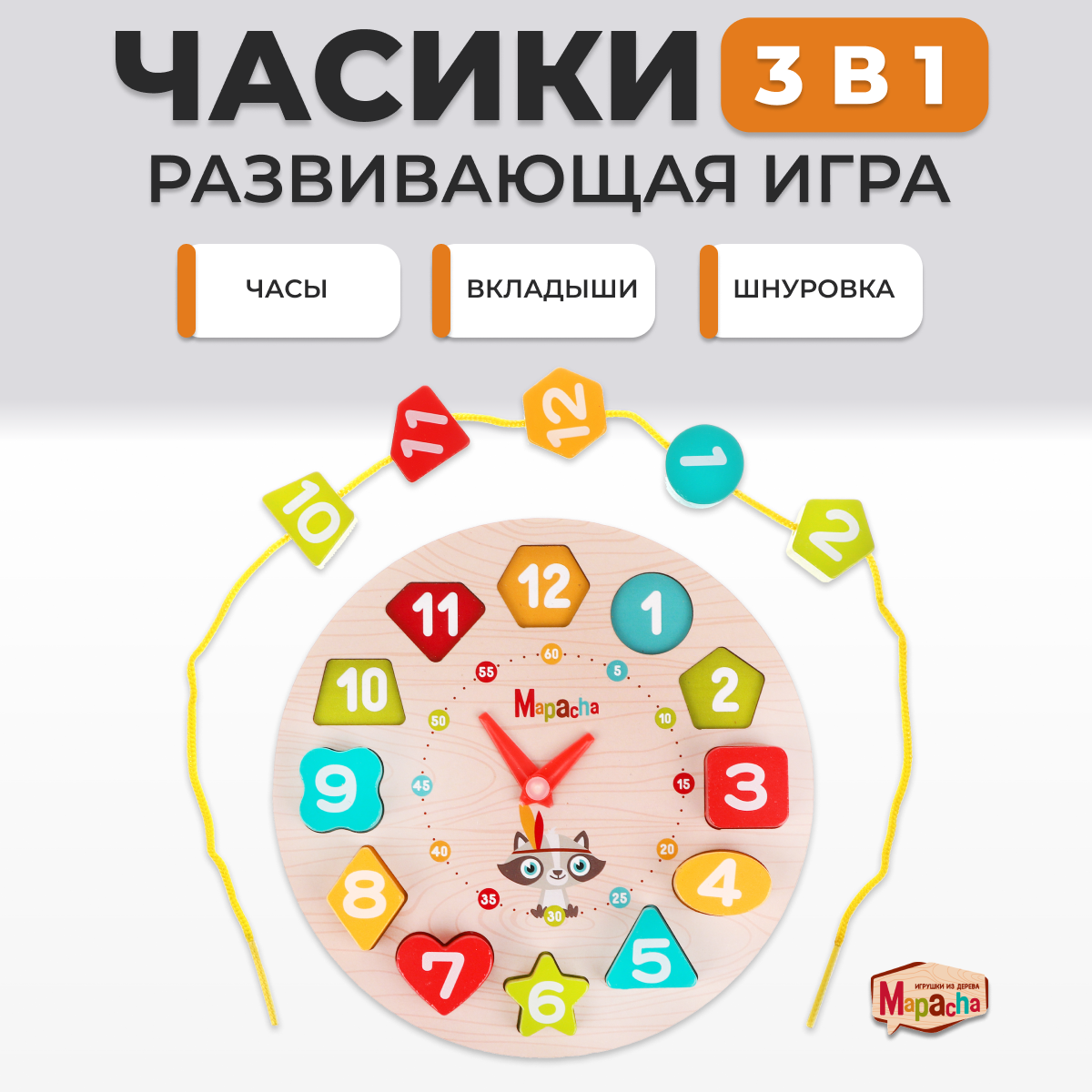 Обучающая игра Mapacha "Деревянные часы", шнуровка, сортер, вкладыши интересное: