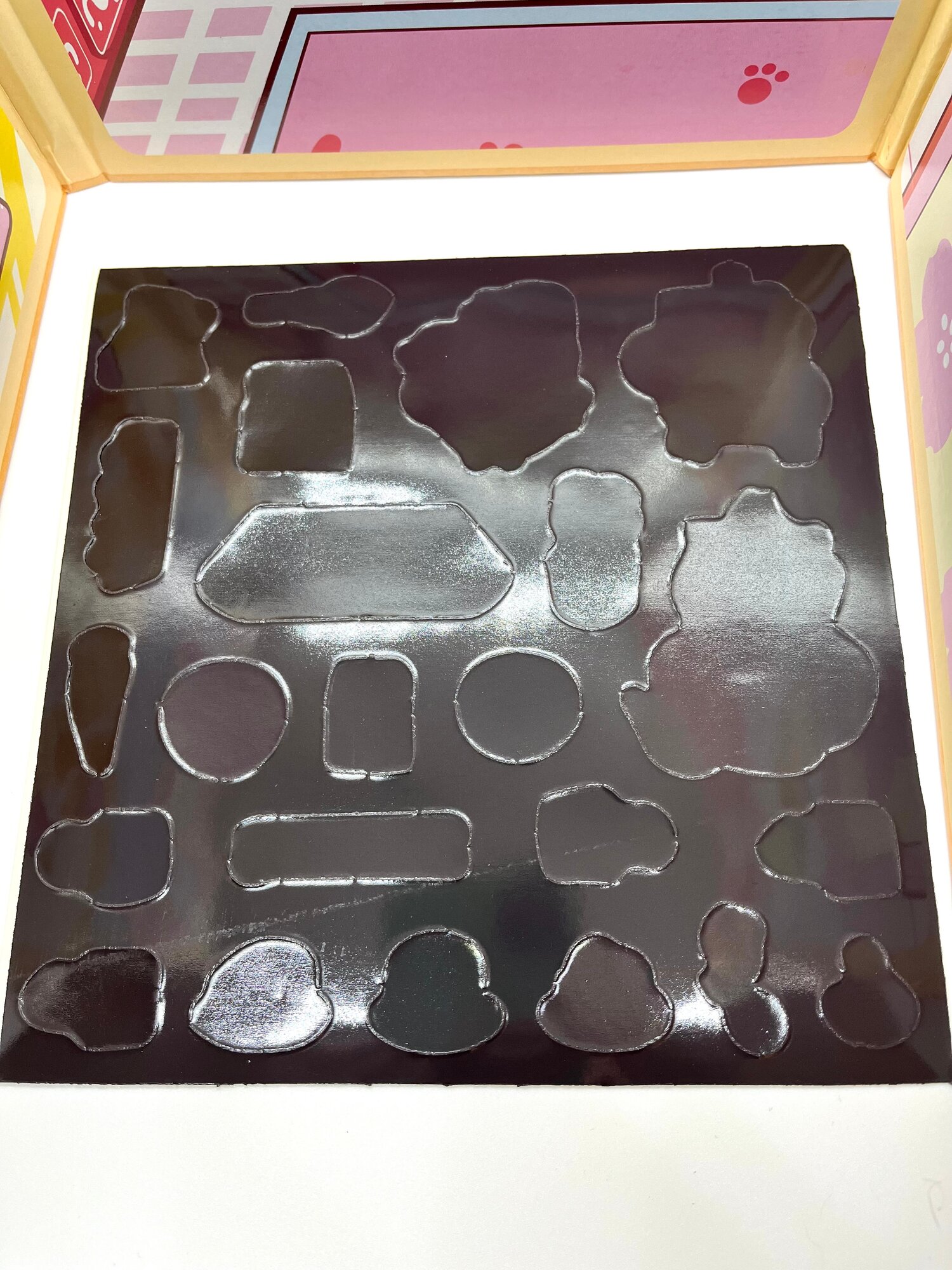 | Комплектация | Бумажные куклы Куроми и мелоди; карточки с разными локациями; фигурки - аксессуары, одежда, еда, посуда и т.д.; скотч; двусторонний скотч; липучки; синтепон. |