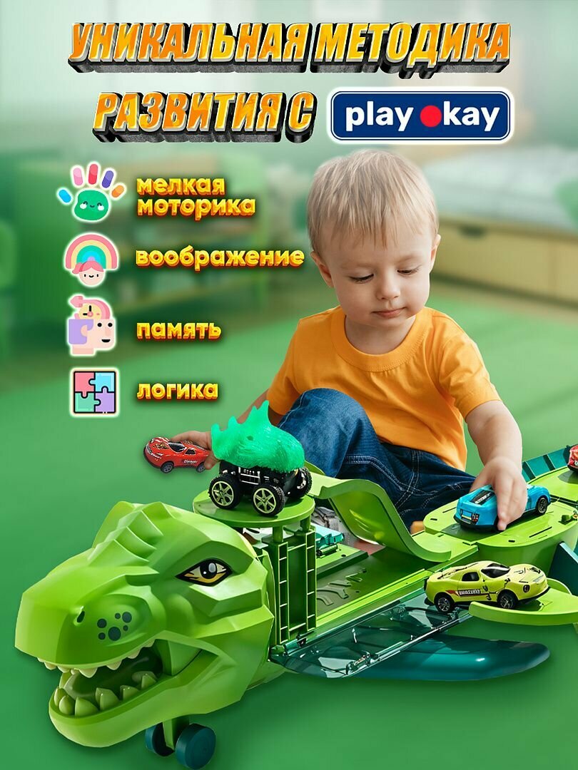 Купить Самолет игрушка грузовой Play Okay динозавр с гоночными машинками, трек и парковка, зеленый