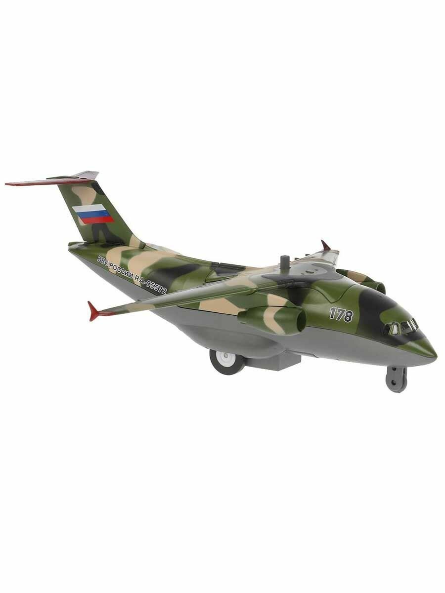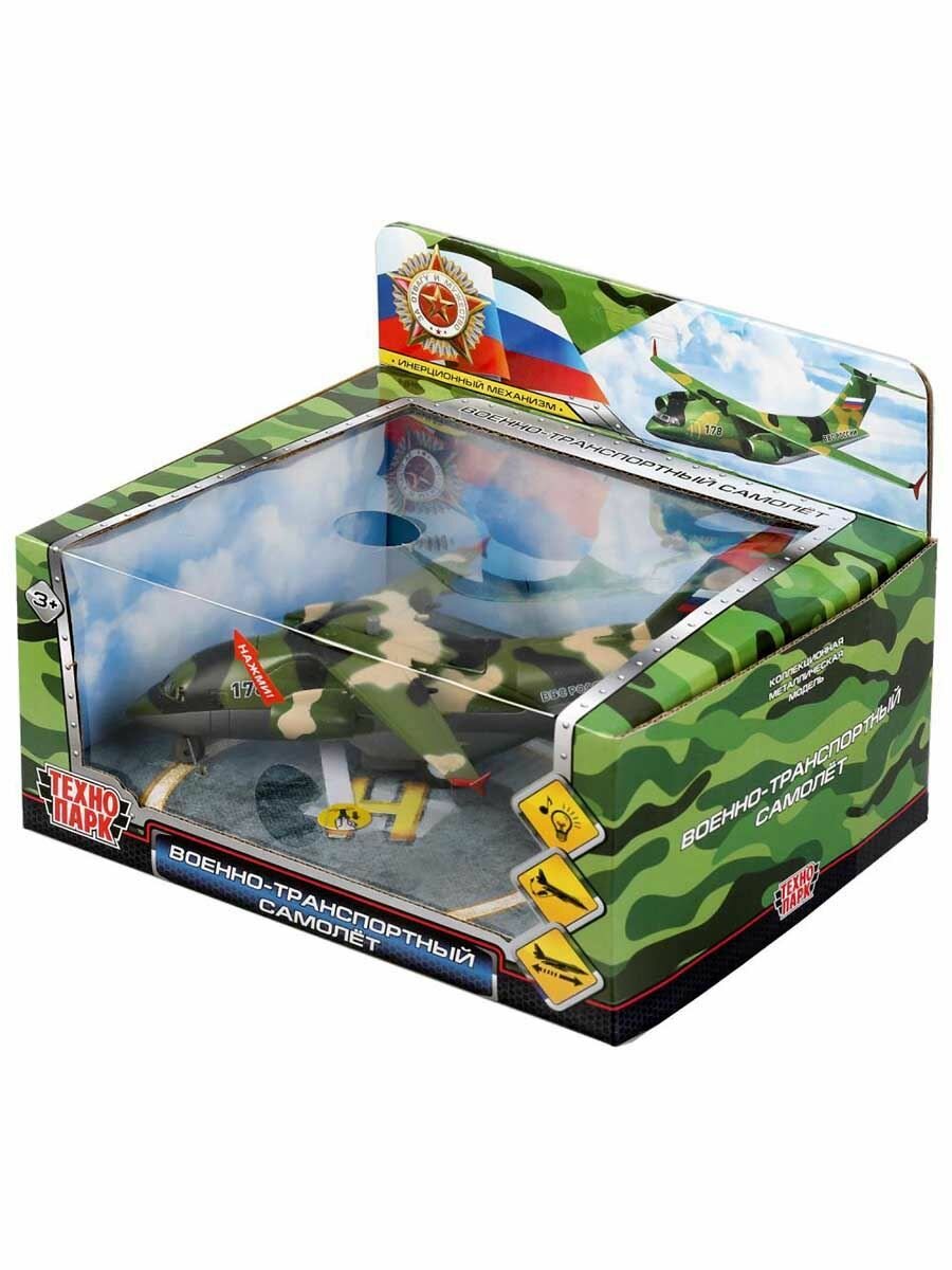 Модель Технопарк Самолет военно-транспортный камуфляж 20см металлический, свет+звук