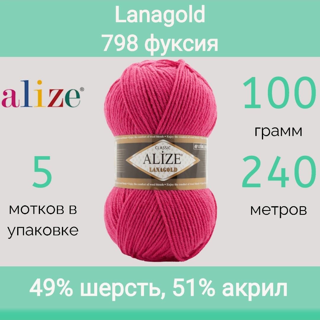 Купить Пряжа Alize Lanagold 798 фуксия (100г/240м, упаковка 5 мотков)