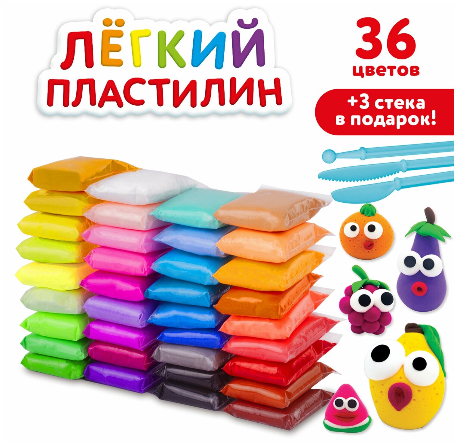 Купить Пластилин супер легкий воздушный застывающий 36 цветов, 360 г, 3 стека