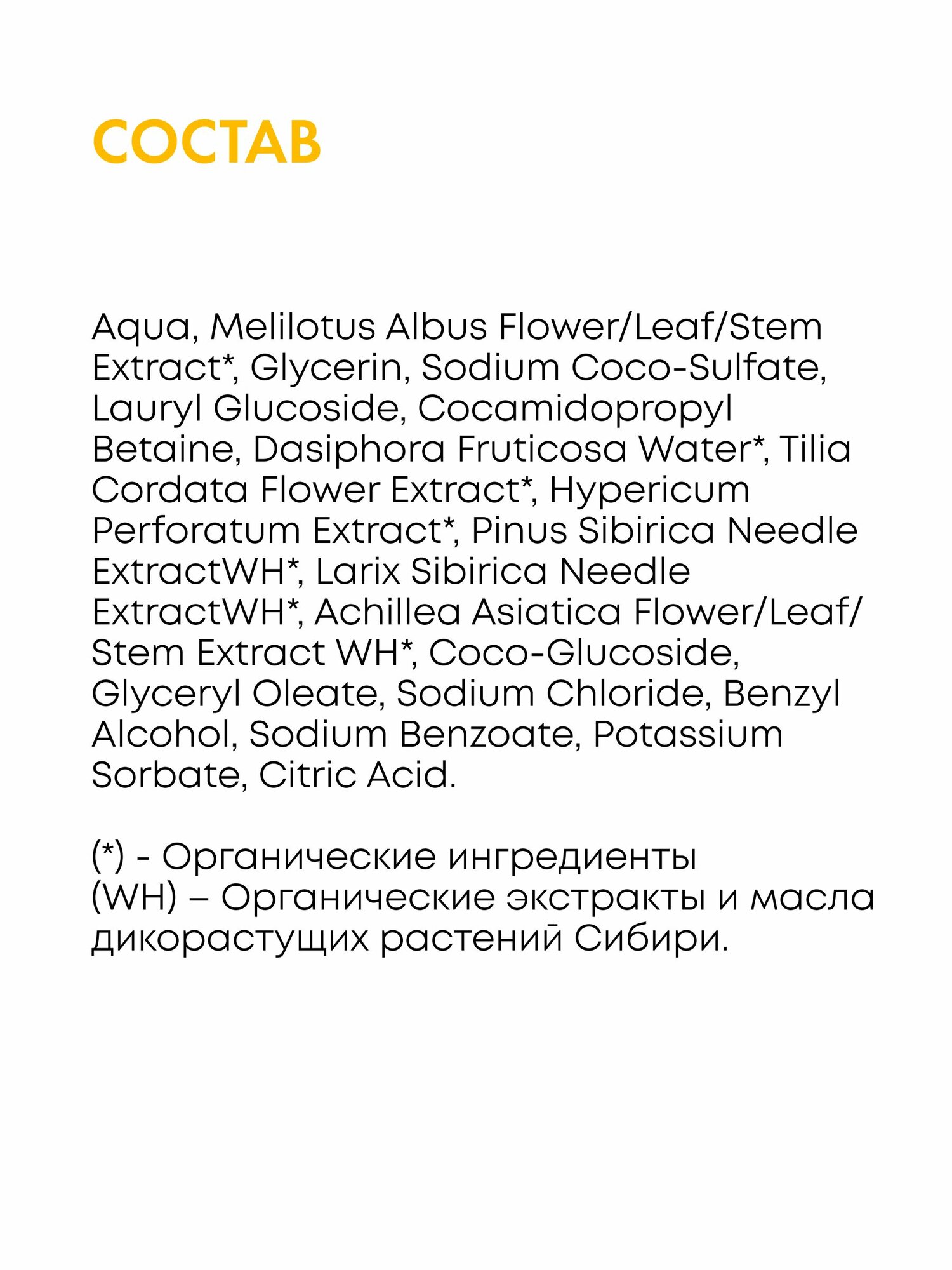 | Состав | Aqua, Melilotus Albus Flower/Leaf/Stem Extract, Glycerin, Sodium Coco-Sulfate, Lauryl Glucoside, Cocamidopropyl Betaine, Dasiphora Fruticosa Water, Tilia Cordata Flower Extract, Hypericum Perforatum Extract, Pinus Sibirica Needle ExtractWH, Larix Sibirica Needle ExtractWH, Achillea Asiatica Flower/Leaf/Stem Extract WH, Coco-Glucoside, Glyceryl Oleate, Sodium Chloride, Benzyl Alcohol, Sodium Benzoate, Potassium Sorbate, Citric Acid. () - Органические ингредиенты (WH) – Органические экстракты и масла дикорастущих растений Сибири. |