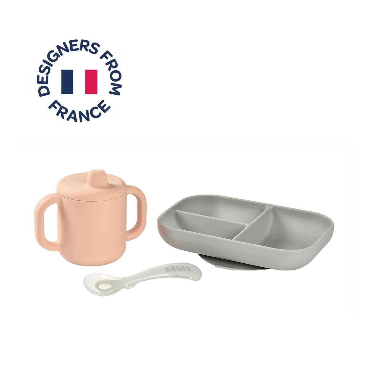 Набор силиконовой детской посуды BEABA: секционная тарелка на присоске, силиконовая кружка с ручками, ложка детская для кормления и прикорма
