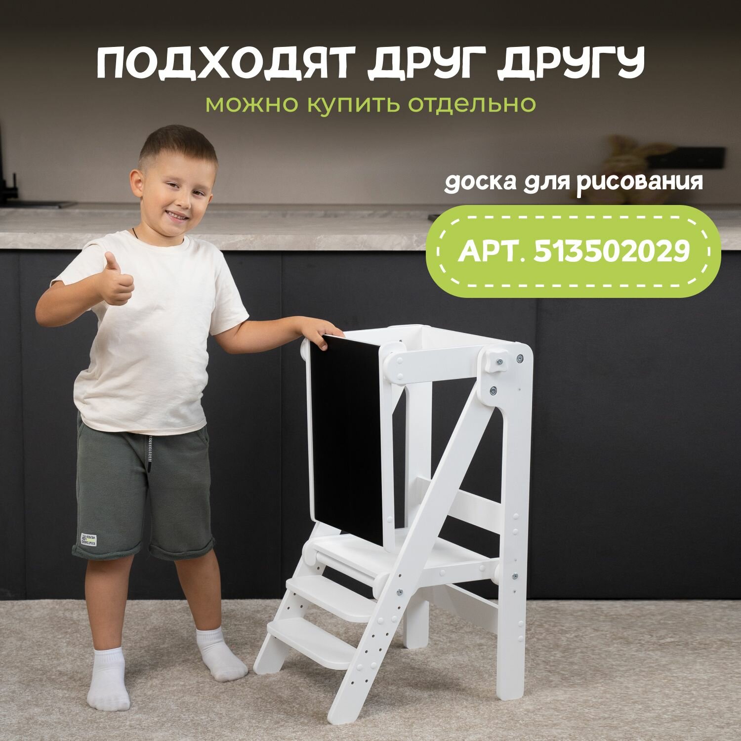 Башня помощника Монтессори "Комфорт Мини белый+лак с доской PAPPADO стульчик для кормления