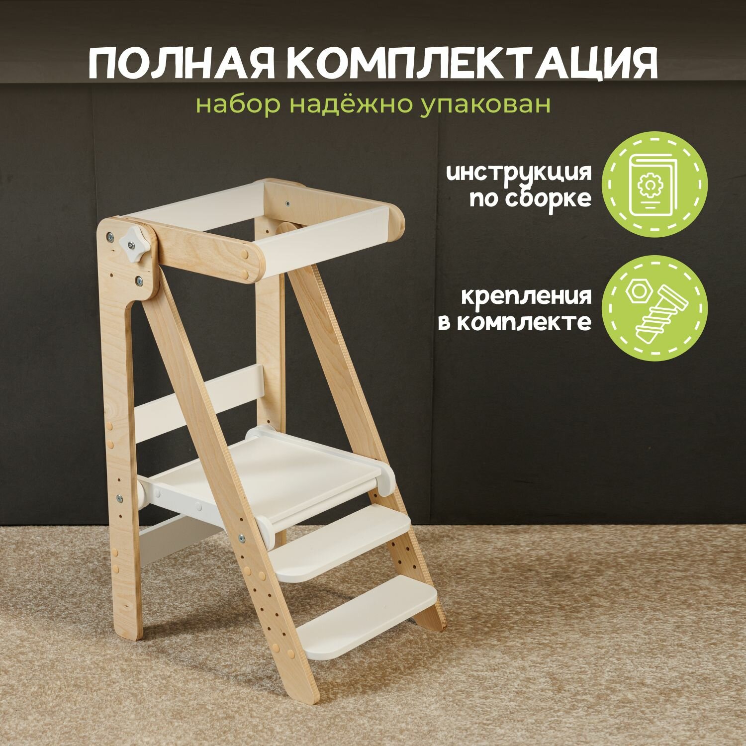 | Комплектация | башня помощника Монтессори / фурнитура / инструкция по сборке |
