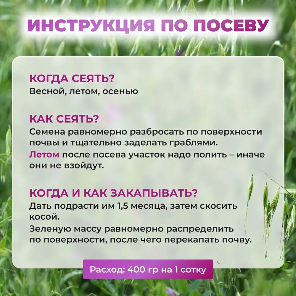 | Трава | горчица / лен / мятлик / овсяница / овсяница красная / овсяница луговая / райграс / райграс многолетний / тимофеевка / фацелия / фестулолиум |
