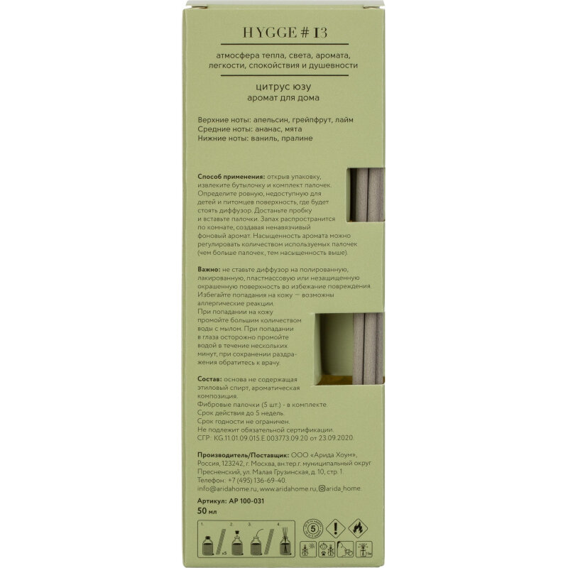 Аромадиффузор Arida Home с палочками, "Hygge", №13, Цитрус юзу, 50 мл