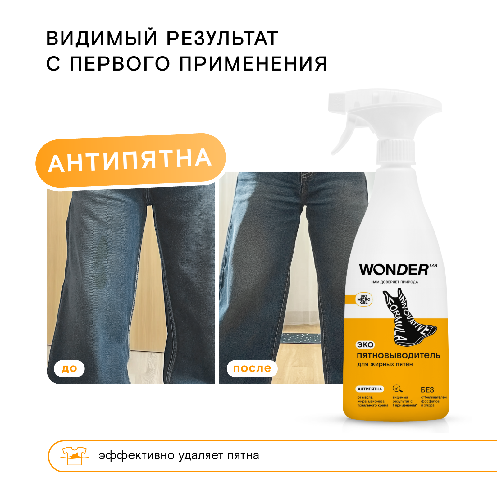 WONDER LAB Пятновыводитель для жирных пятен и загрязнений чистящее средство для одежды эко спрей от пятен 0.55л