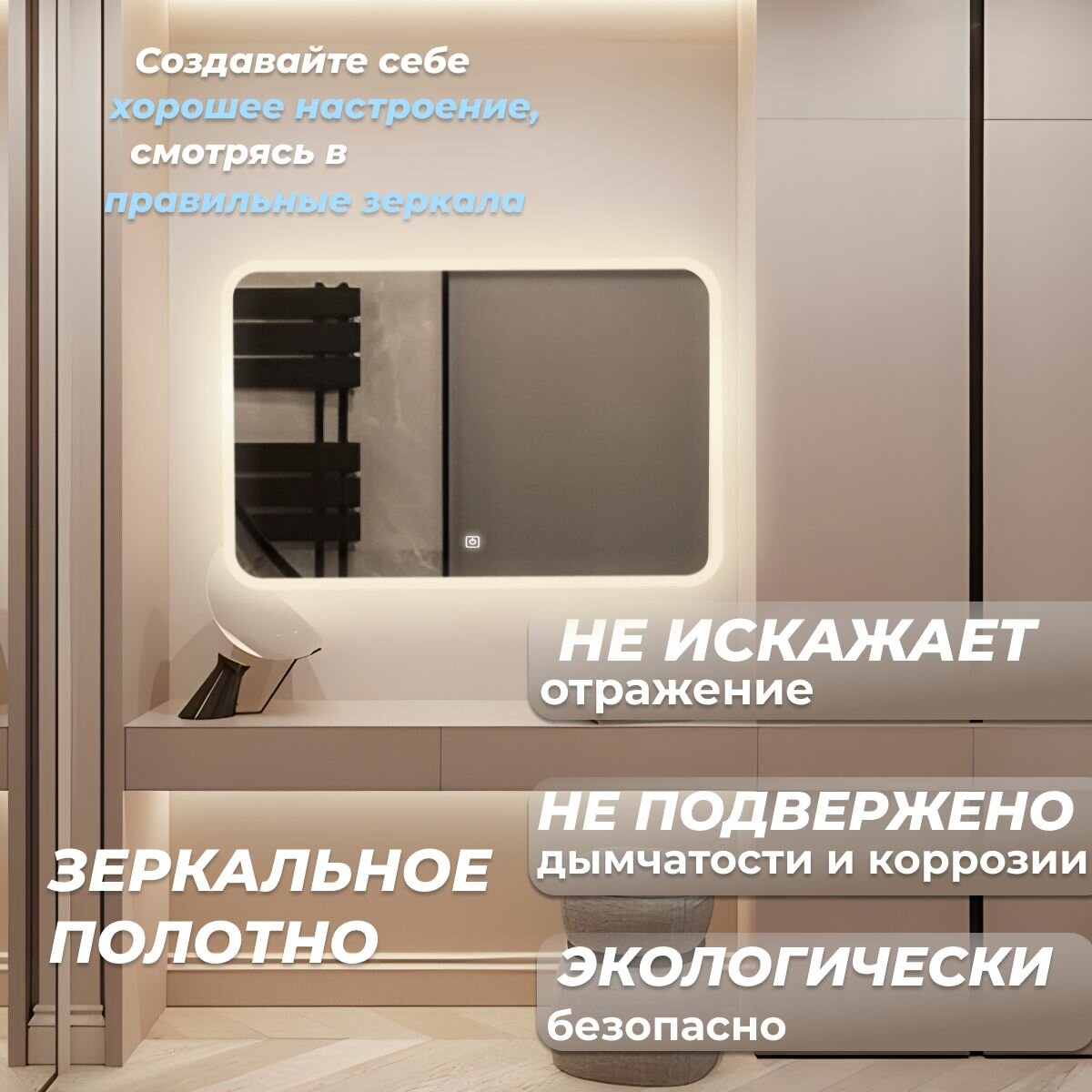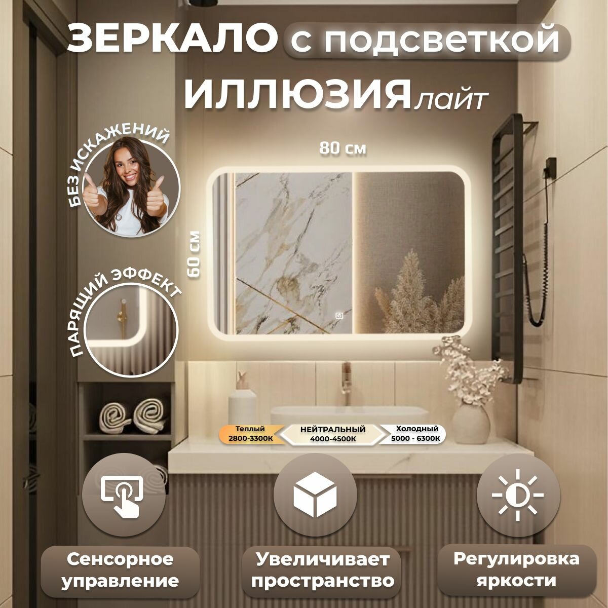 СохранитьЗеркало настенное Иллюзия лайт , нейтральная подсветка, сенсорный выключатель, для ванной, 80х60 интересное:
