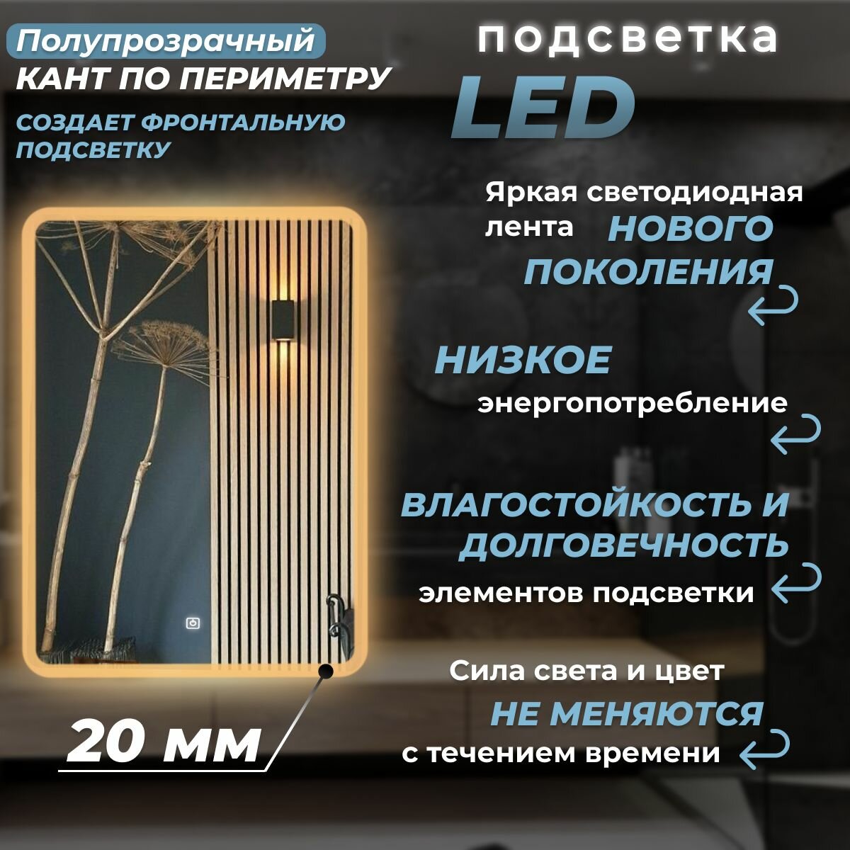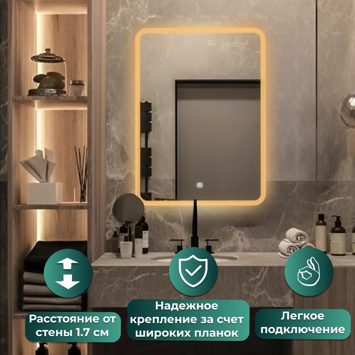 СохранитьЗеркало настенное Иллюзия лайт, теплая подсветка, сенсорный выключатель, для ванной, 50х80 интересное: