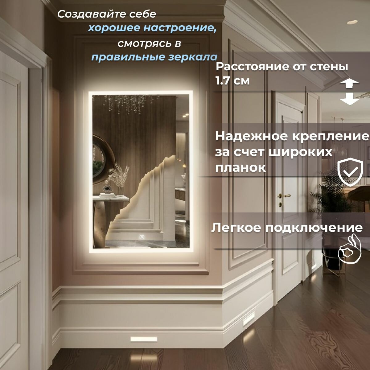 Зеркало настенное Иллюзия лайт, теплая подсветка, сенсорный выключатель, для ванной, 50х80