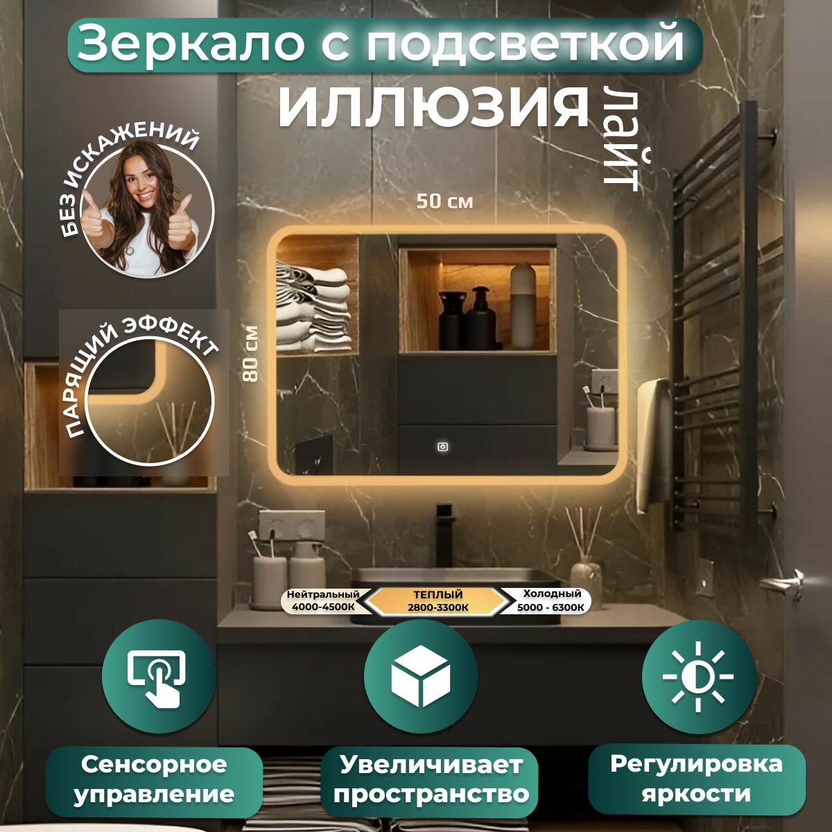Купить Зеркало настенное Иллюзия лайт, теплая подсветка, сенсорный выключатель, для ванной, 80х50