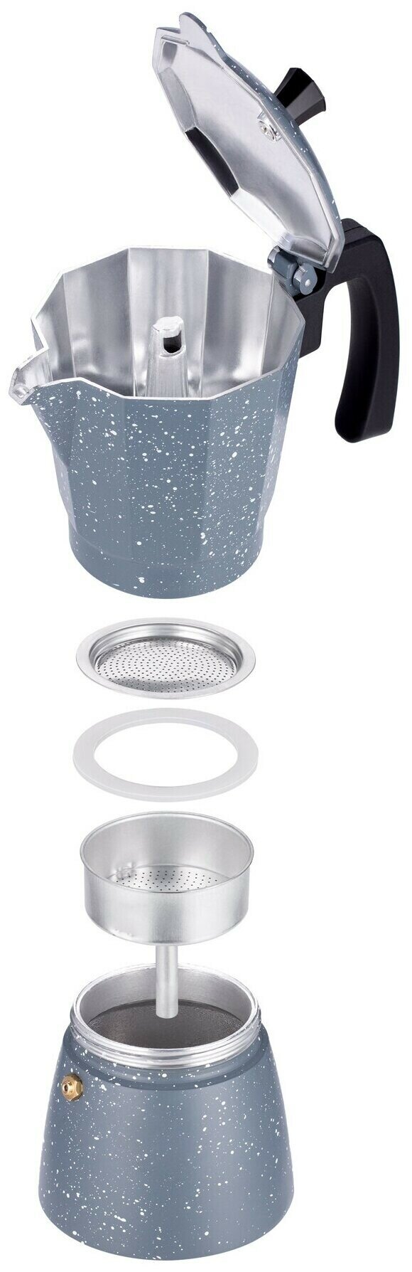 | Дополнительная информация | Современная гейзерная кофеварка выполнена из высококачественного алюминия, имеет удобную ручку, которая не нагревается. Кофеварка состоит из двух емкостей, разделенных специальным фильтром. Готовить любимый кофе в гейзерной кофеварке - одно удовольствие. Вы легко и быстро заварите ароматный кофе с пенкой для самых близких сердцу людей! Очень удобная в использовании и уходе. Окружайте себя практичными и приятными вещами! Объем 0.45 л. Количество порций 9. Высота 23 см. Вес 0.6 кг. Особенности - теплоизоляционная ручка. Мытье в посудомоечной машине - да. Цвет - мрамор. |
