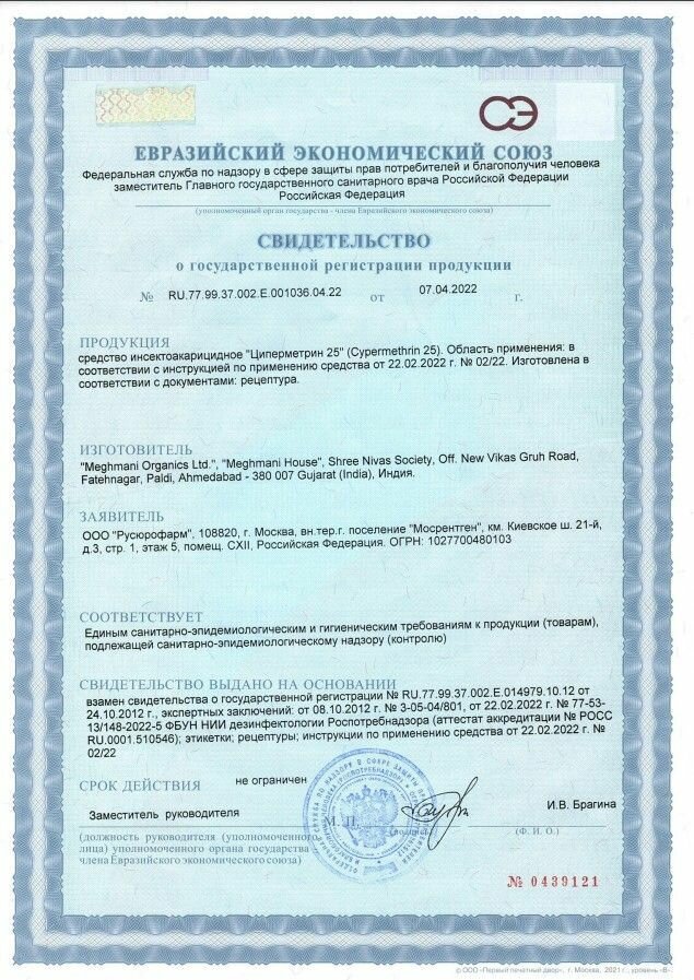 | Подробная комплектация | Циперметрин 250 - 50 мл, флакон |