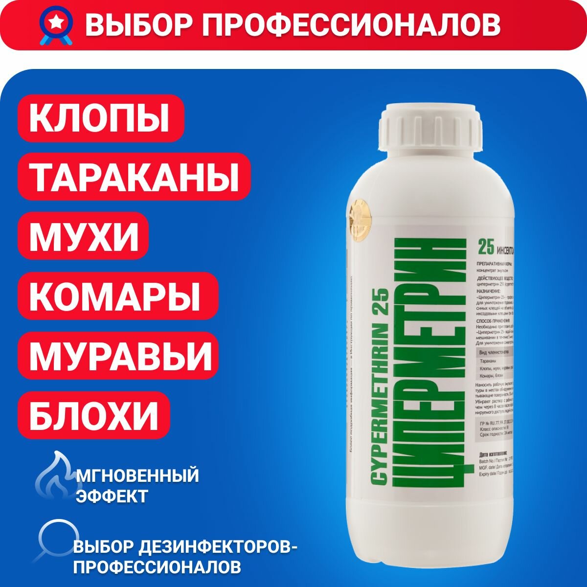 Циперметрин 25 средство от клопов, тараканов, блох, муравьев, мух, комаров, иксодовых клещей, 1 л
