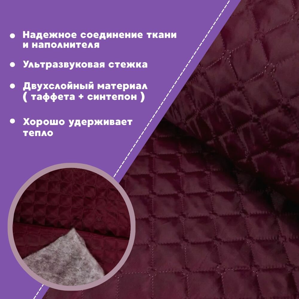 ткань термостеганая подкладочная Таффета+синтепон, цвет бордовый, ш-150 см, на отрез, цена за 2 пог.метра